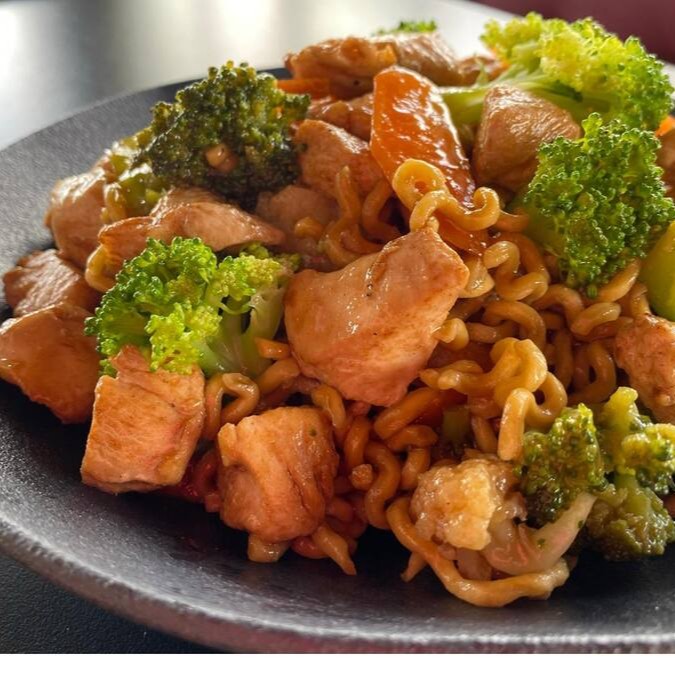 Macarrão, frango, legumes e molho oriental.