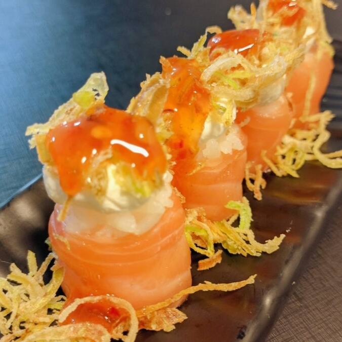 Salmão, camarão, pepino, cream cheese, alho poró e pimenta Sweet Chilli.