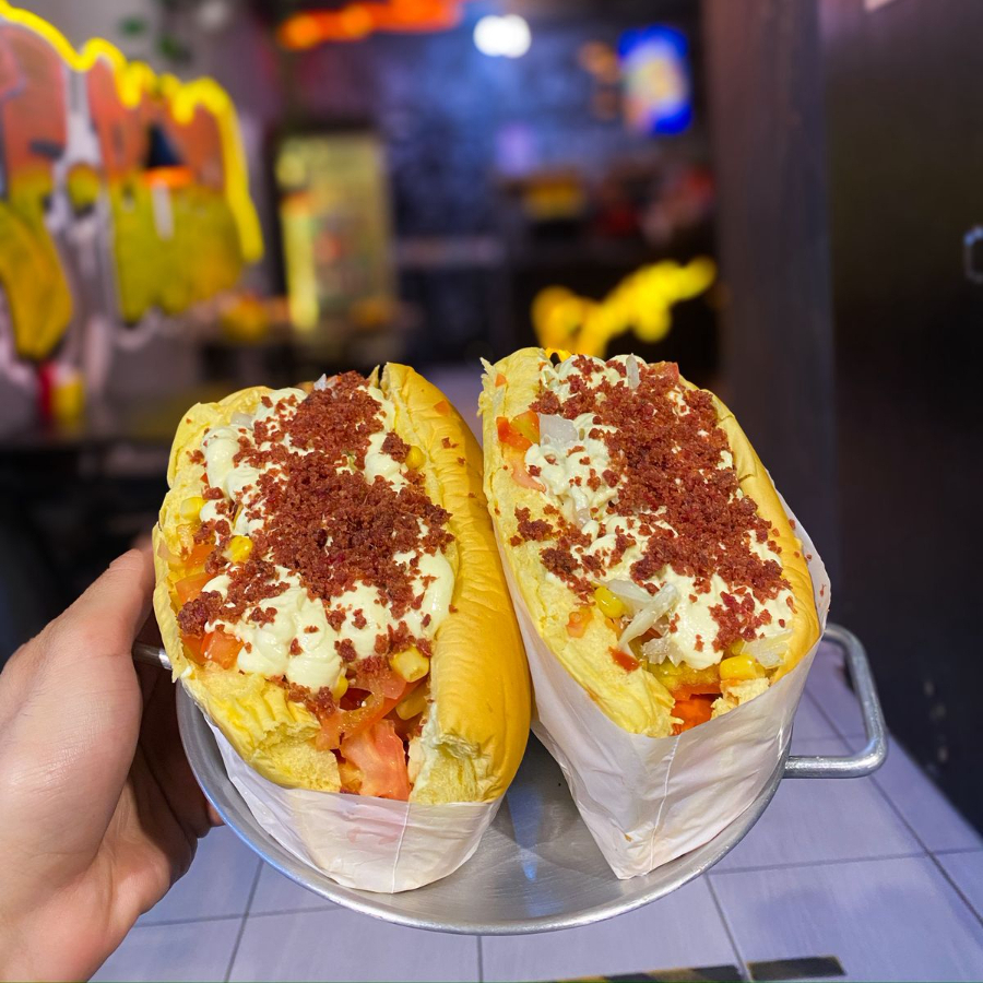 Pão brioche, 2 vinas (salsichas), maionese artesanal, ketchup, maionese artesanal, ketchup, mostarda, milho, tomate, bacon triturado, batata palha moída e purê de batata.