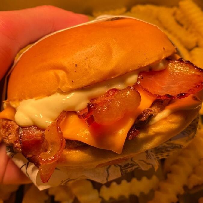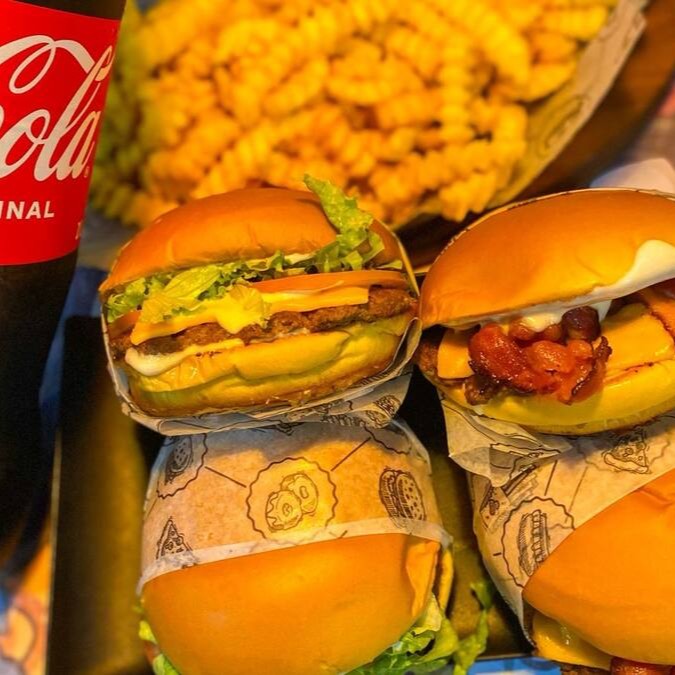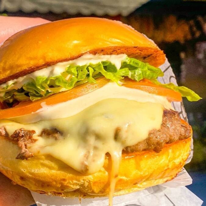 Pão brioche, Hambúrguer Amassado de 70g, Fatias de Cheddar derretidas, Bacon Crocante e Maionese Temperada Smoke.