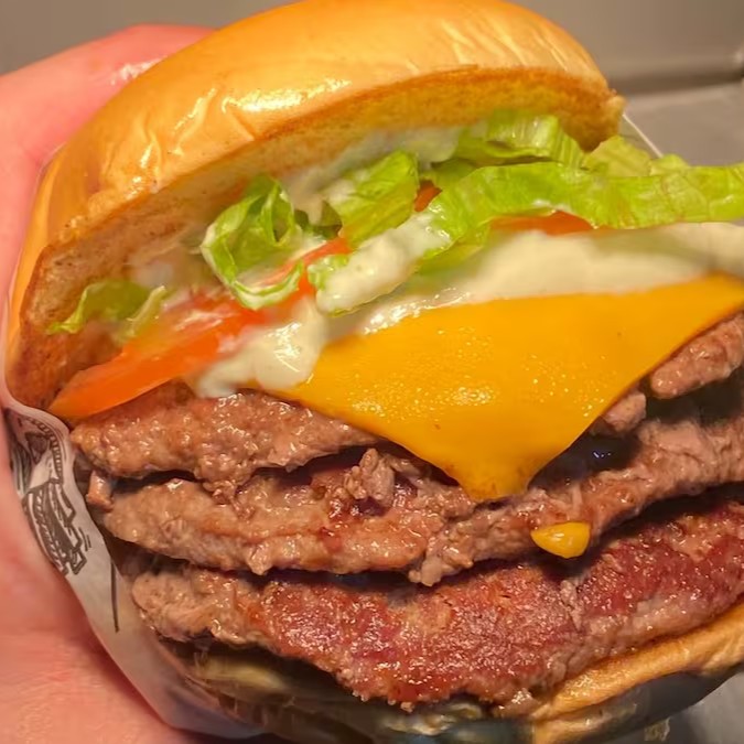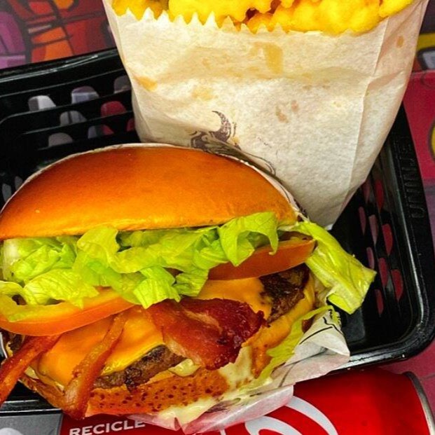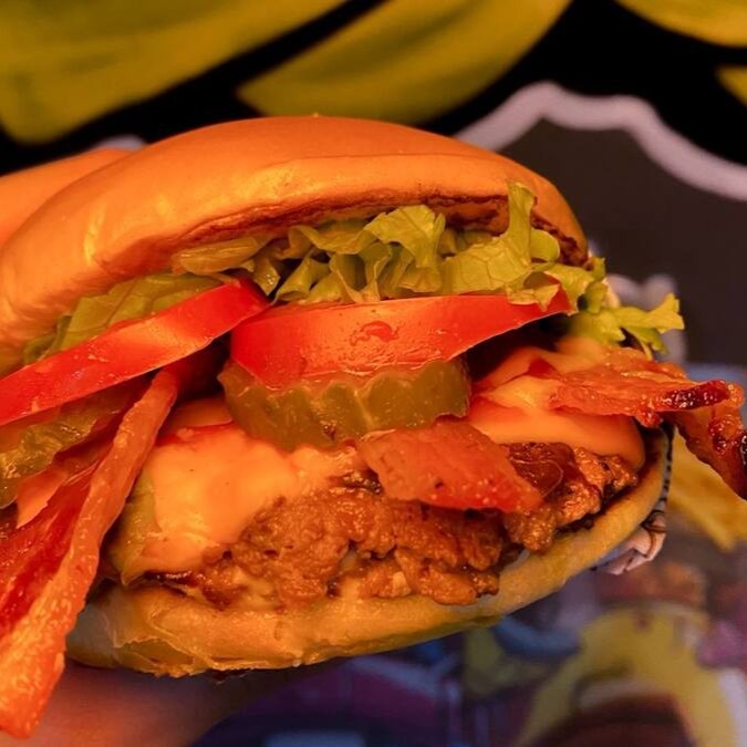 Pão brioche, 3 hambúrgueres de 70g com alface fresquinha, tomate em fatias, 1 fatia de Queijo cheddar, molho smoke (maionese de alho + fumaça em pó) especial para finalizar