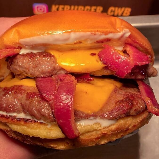 Pão brioche, 2x Hambúrgueres de 70g amassados, 2x Queijo Cheddar derretido e Bacon Crocante, e para finalizar Maionese Artesanal