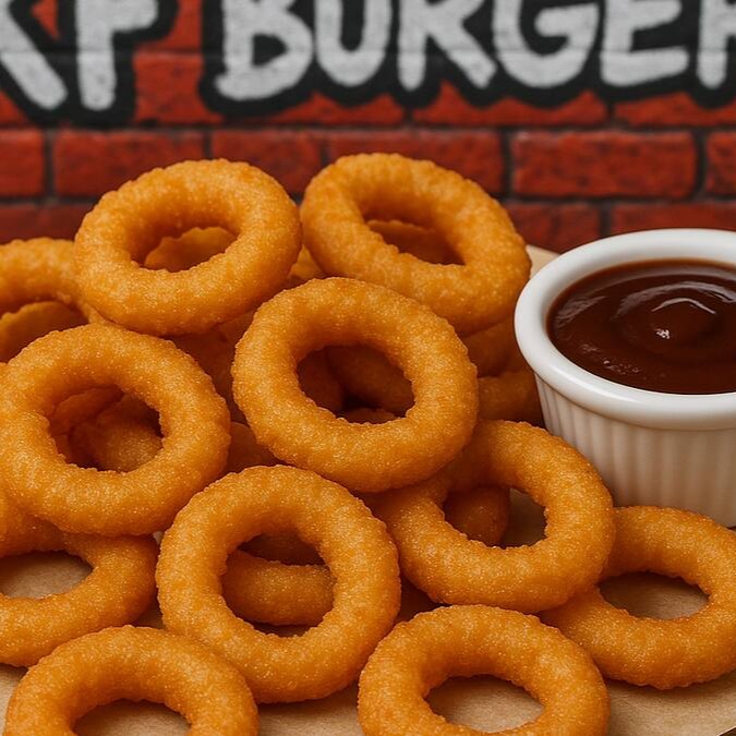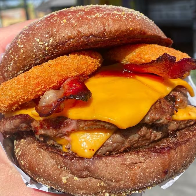 Pão australiano, Dois hambúrgueres de 110g, queijo cheddar derretido, onion rings, barbecue, maionese artesanal e bacon crocante