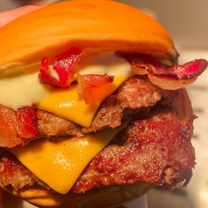 Uma explosão de sabor com dois hambúrgueres suculentos de 110g cada, dupla porção de queijo cheddar levemente derretido, dupla dose de bacon crocante e uma generosa camada de cheddar cremoso, tudo abraçado em um pão brioche macio