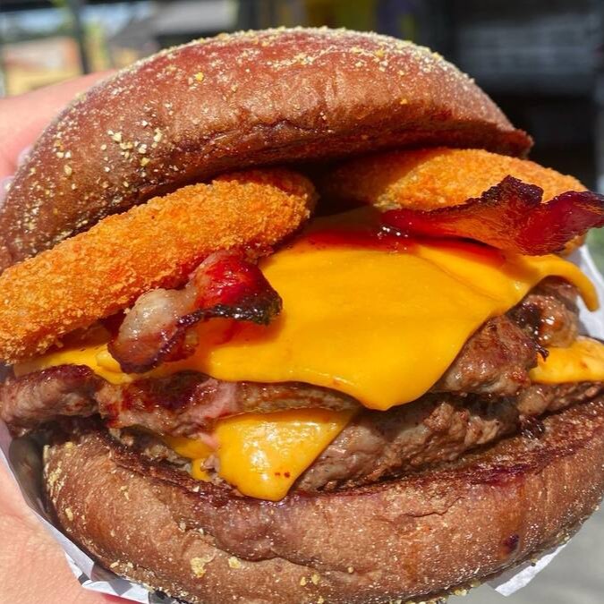 Pão australiano, Dois Hambúrgueres de 110g cada, Cobertos com Queijo Cheddar derretido, seguido por 2 Onion rings, Bacon crocante e Barbecue, para finalizar Maionese Artesanal de fumaça