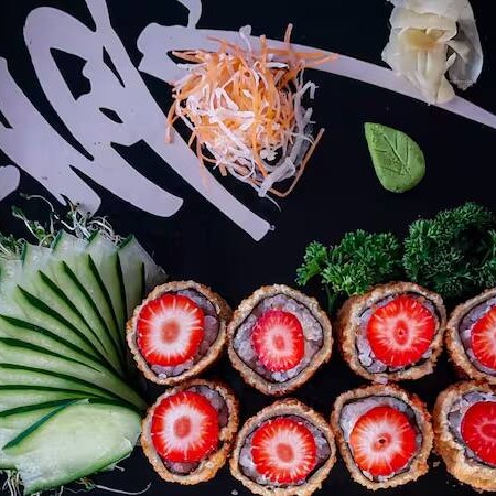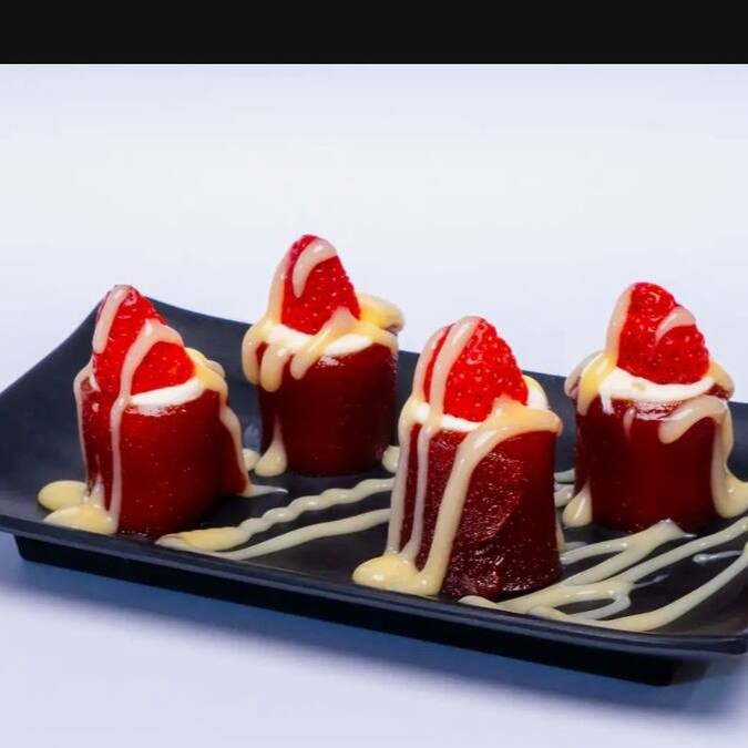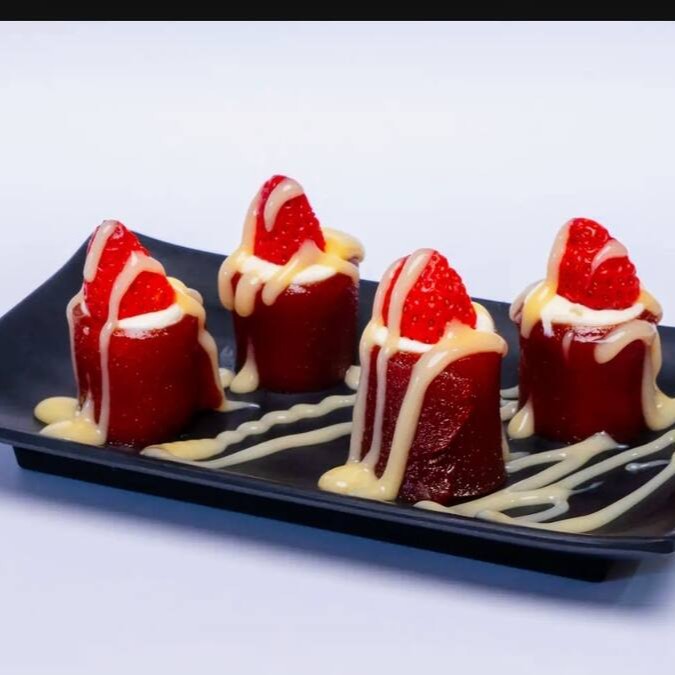 Arroz, creem chease, morango enrolado na alga, logo empanado na massa panko e frito. Com cobertura de leite condensado.