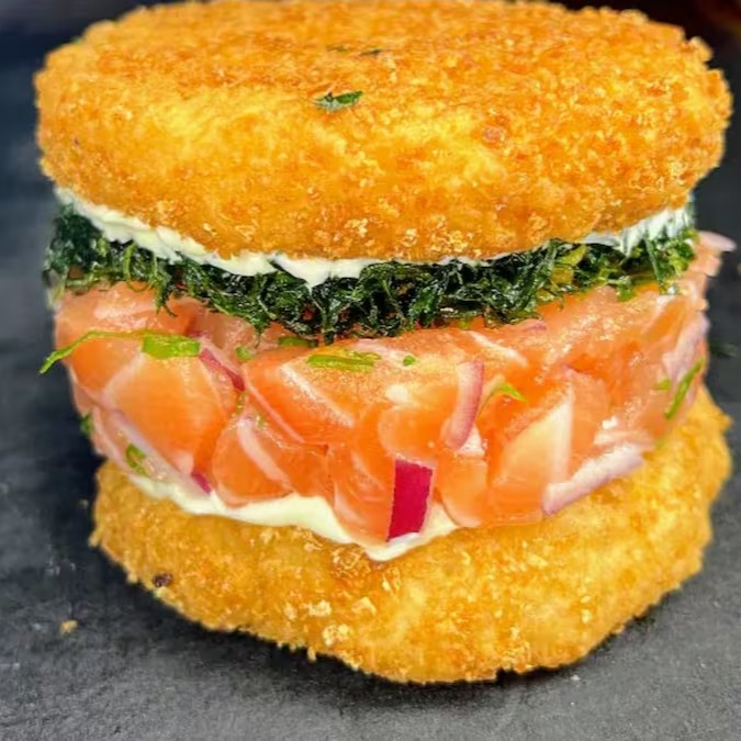 Apresentamos o nosso Sushi Burguer, uma inovação culinária que combina o melhor da cozinha japonesa com um toque ocidental. Este prato é composto por um generoso hambúrguer de sushi, com arroz Shari cuidadosamente empanado e frito até atingir a perfeição crocante. O recheio é uma mistura irresistível de cream cheese cremoso,e salmão fresco cortado em cubos.e um toque final de crispy de cebolinha. Uma iguaria do chef que promete uma experiência gastronômica única.
