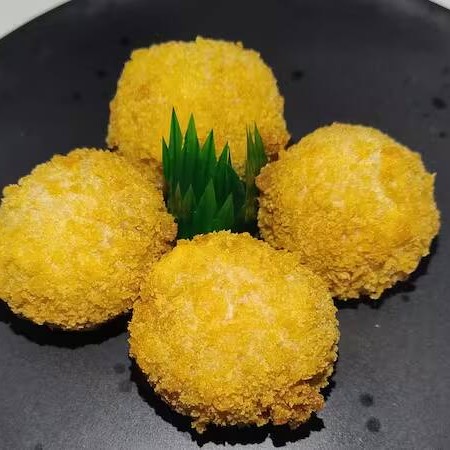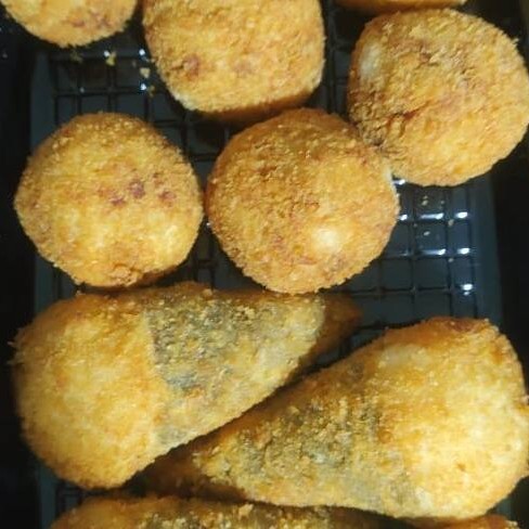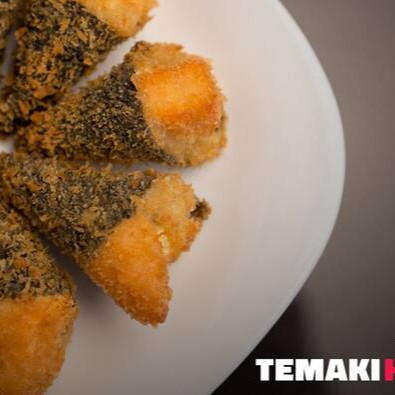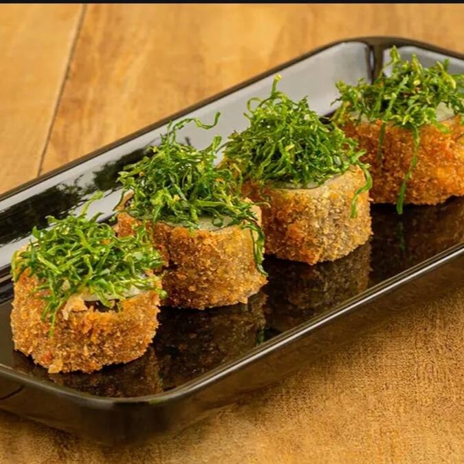 Arroz, salmão, creem chease enrolado na alga, logo empanado na massa panko e frito.