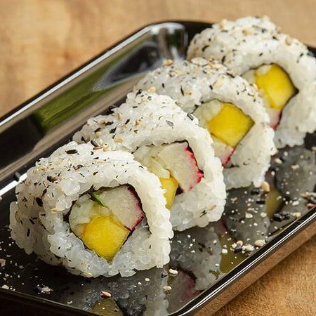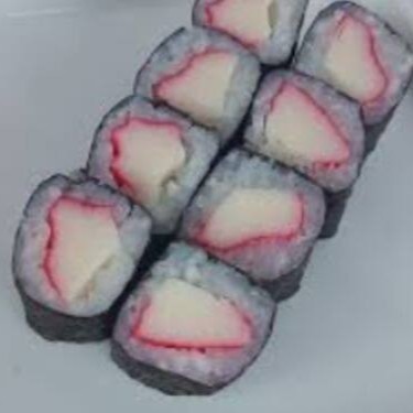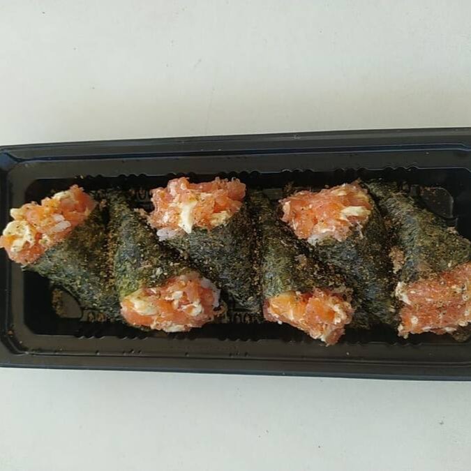10 Unidades enrolado nori e arroz com recheio de Salmão, cream cheese, kani kama e geleia de pimenta.
