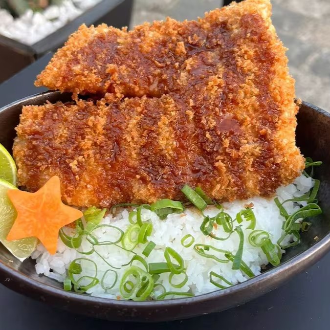 Gohan (arroz japones), lombo suíno empanado na farinha panko, temperado com molho da casa e envolto por ovo e cebola.
