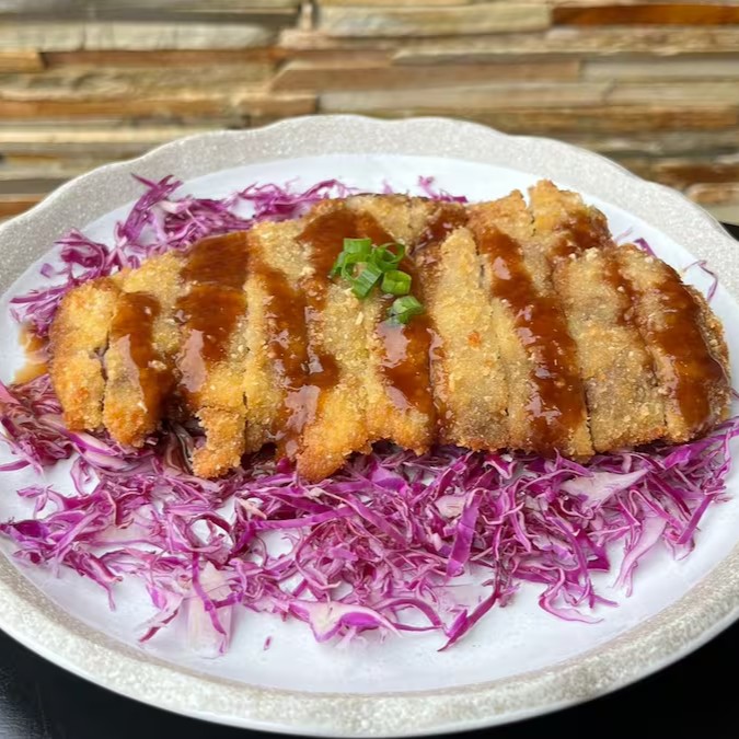 Porção de copa lombo suíno empanado na farinha panko com molho japonês (bull dog) e repolho