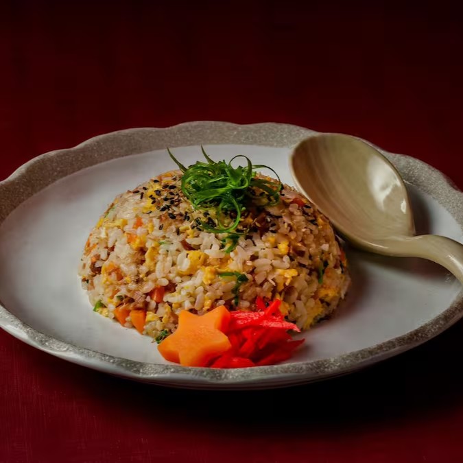 Arroz frito, com legumes, ovo, carne suína em cubos e tempero da casa