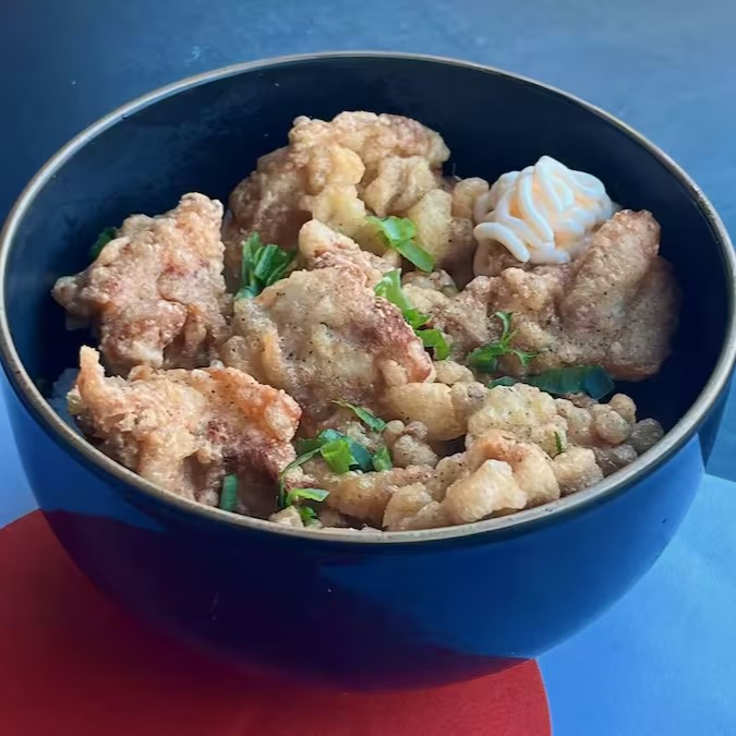 Gohan (arroz japones), karaage (sobrecoxa de frango empanada) e maionese