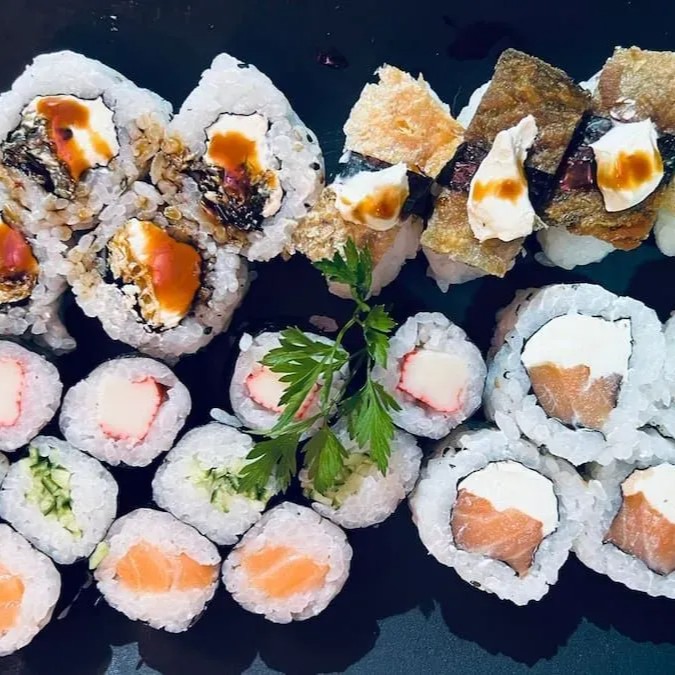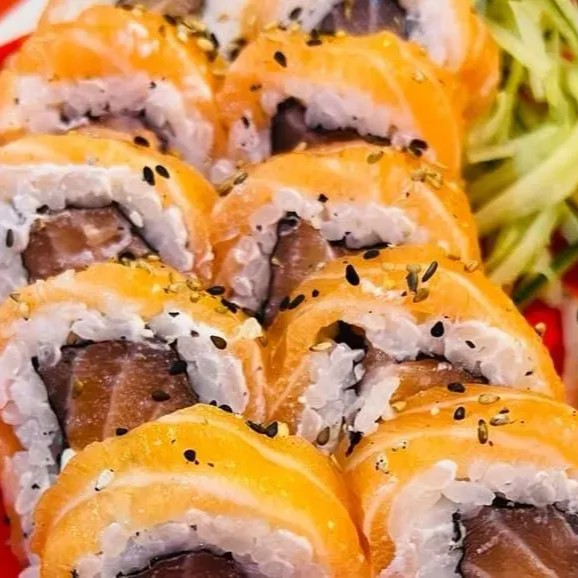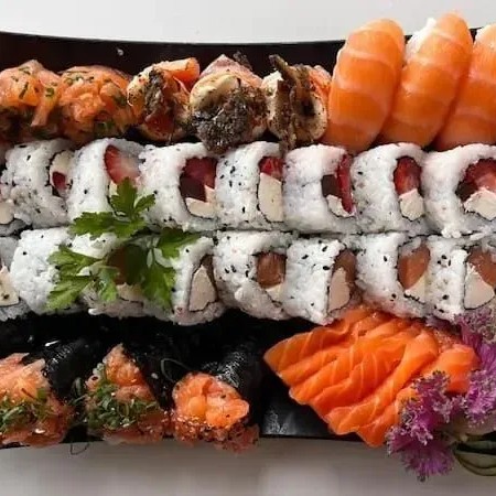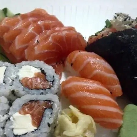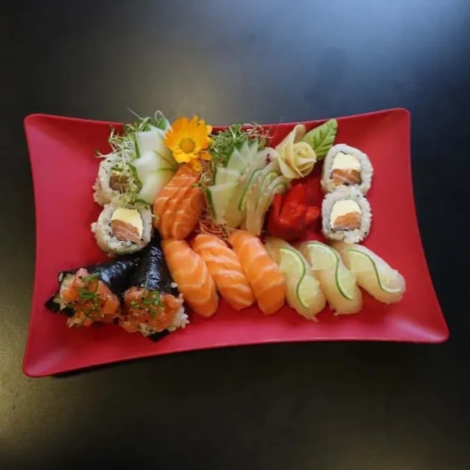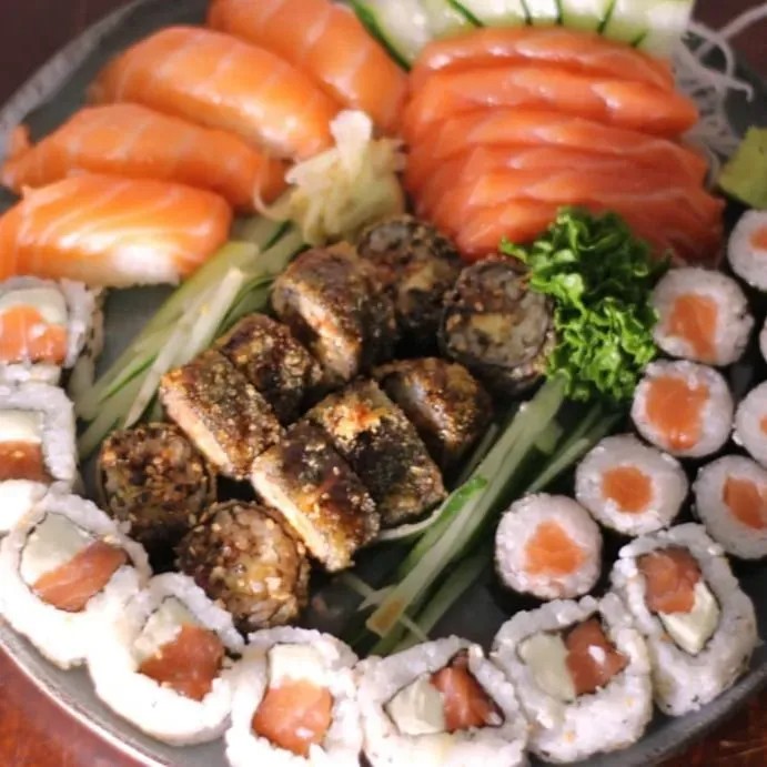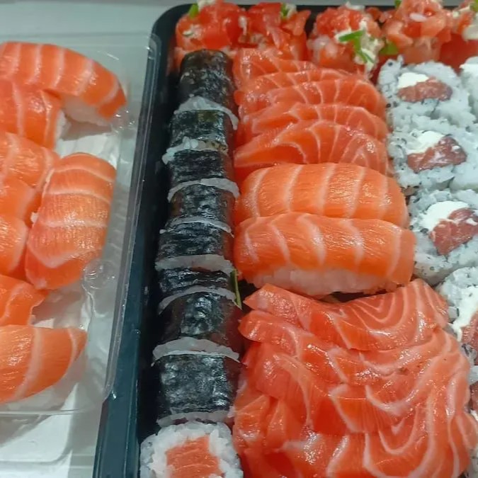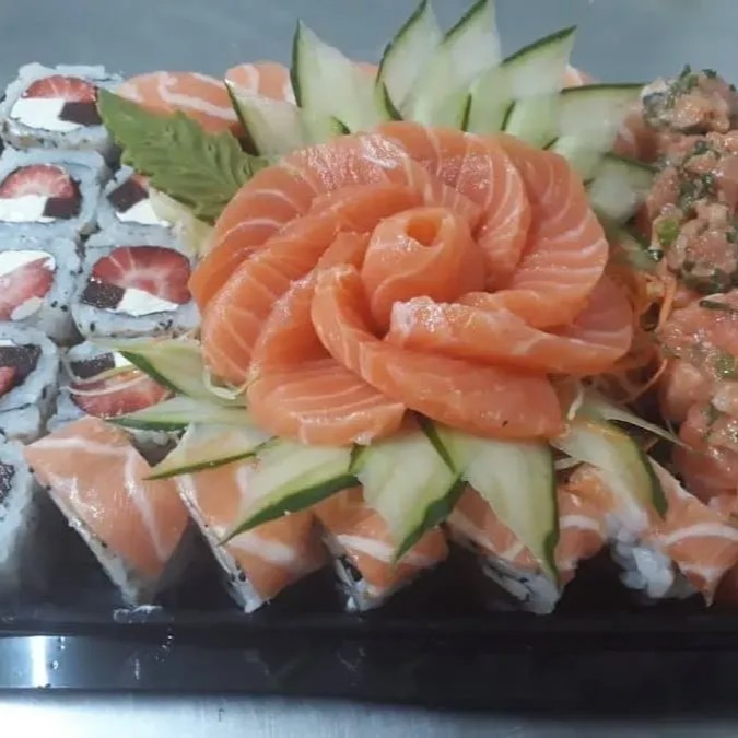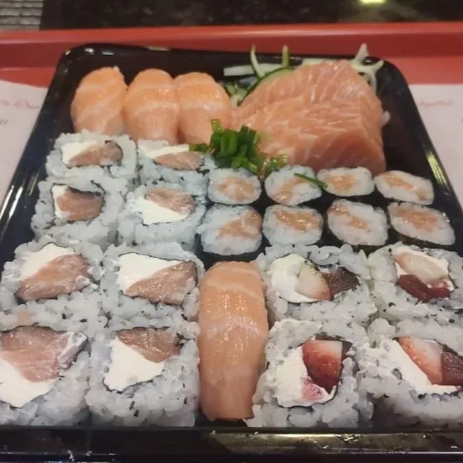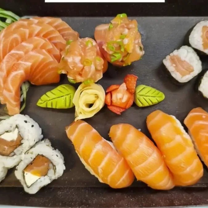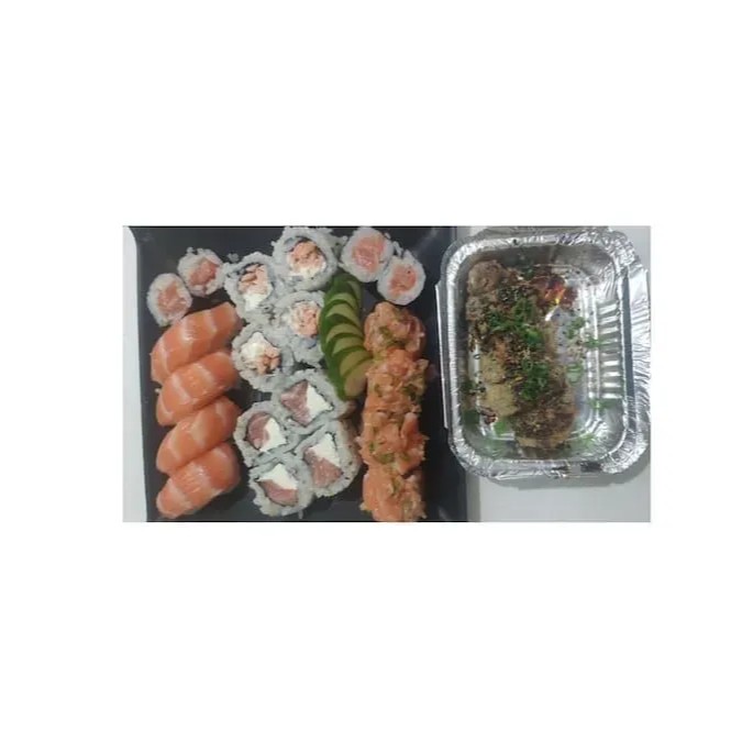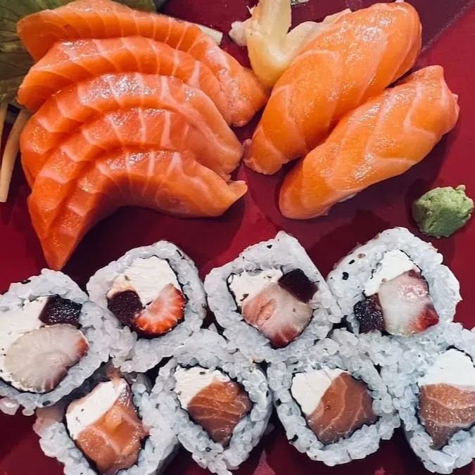 2 Niguiris salmão 4 Uramaki Filadélfia , 4 Uramaki romeu e julieta 5 Sashimi salmão