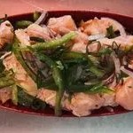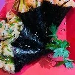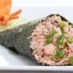 Acompanhamento arroz , salmão ,cream chesse , pimentão, cebola roxa , pepino , manga , kani kama ,gergilin.