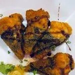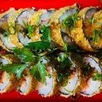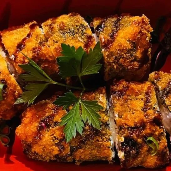 Hot filadelfia mais incrementado com kani, cebolinha, salmão, pele de salmão , cream cheese e geleia de pimenta doce .