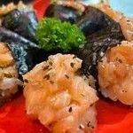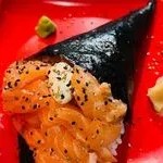 Arroz ,salmão ,cream cheese com uma fatia de salmão cobrindo.