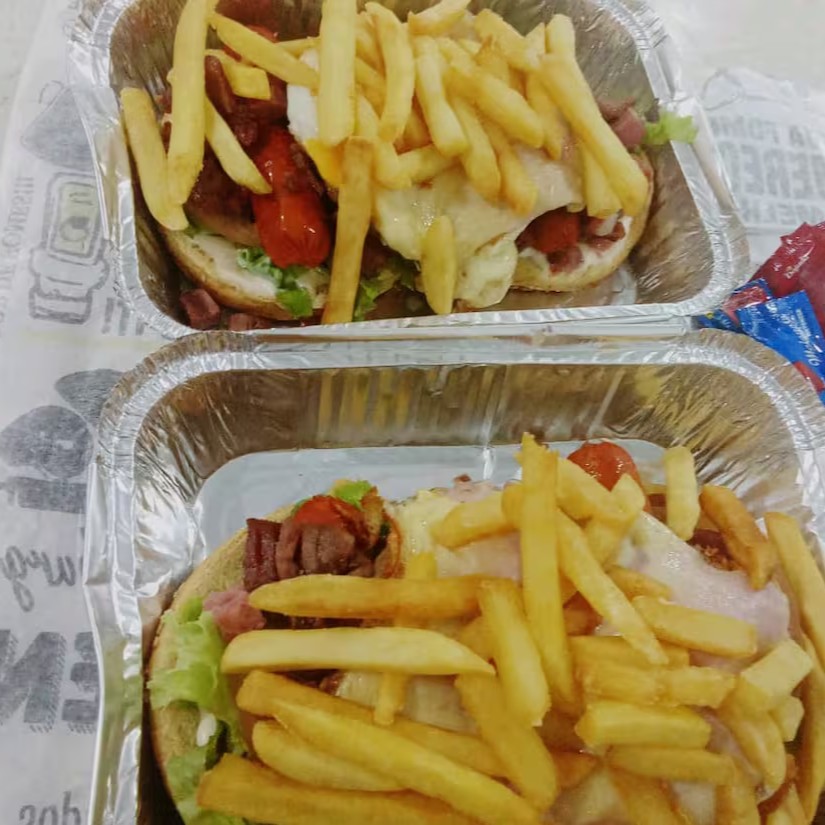 Pão, hambúrguer, bacon, calabresa,vina ,ovo, presunto, queijo,salada , maionese , batata frita