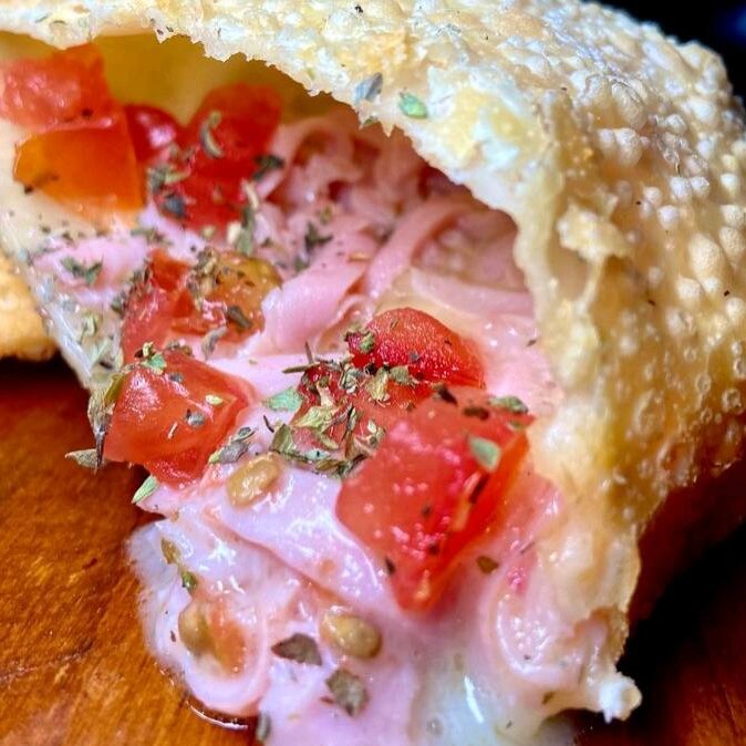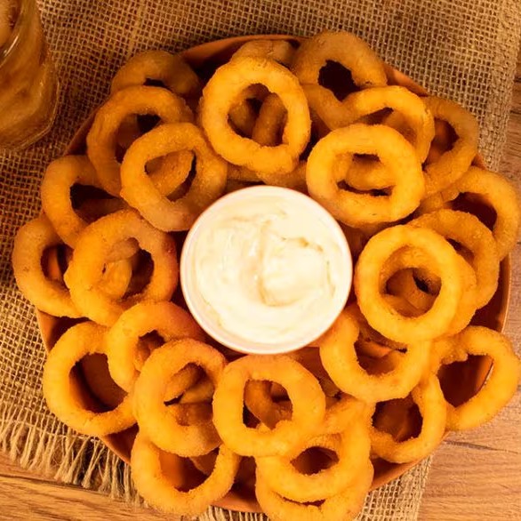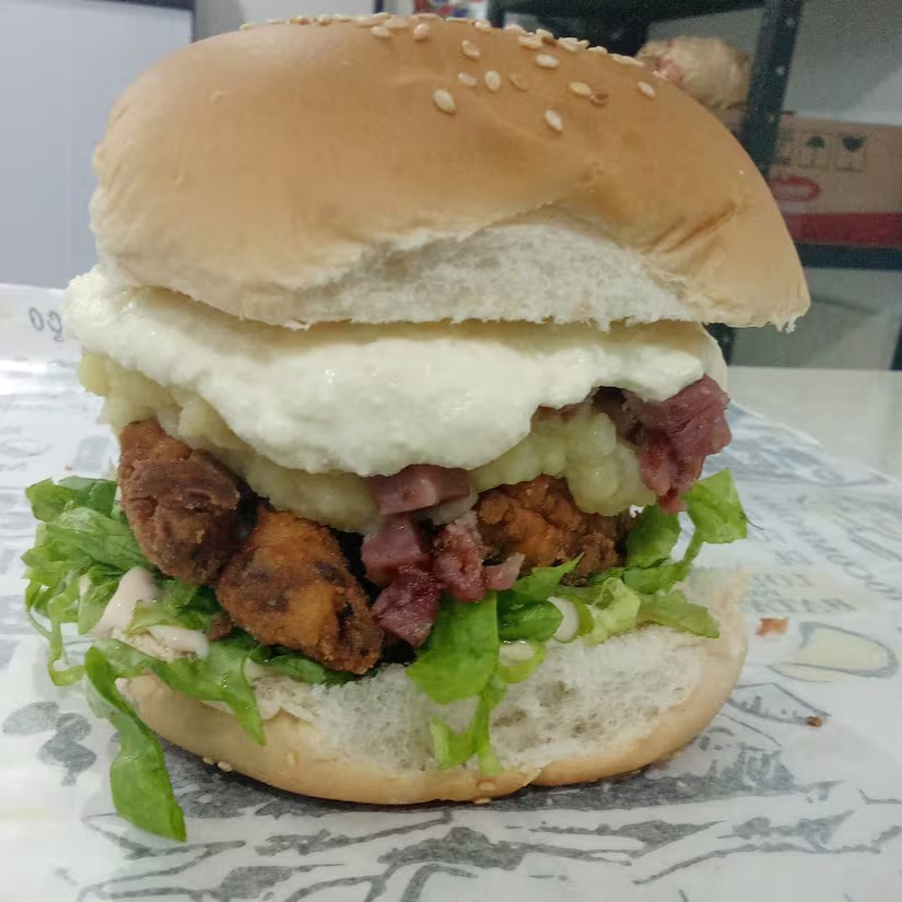 Pão, sassami, anéis de cebola, picles, maionese de bacon