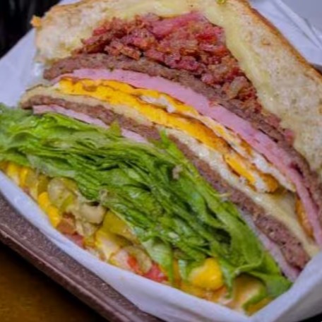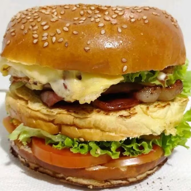 Pão, hambúrguer, presunto, queijo, ovo, salada, maionese
