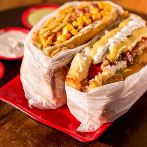Pão, maionese de bacon, 3 vinas, bacon, purê de batata, milho, tomate, Catupiry, batata palha