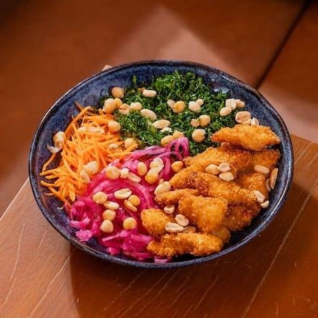 Tilápia empanada, grão de bico, couve crispy, cenoura, picles de cebola roxa, milho crocante.