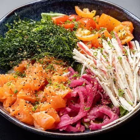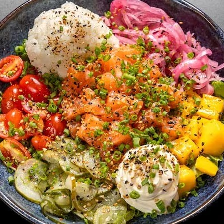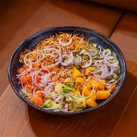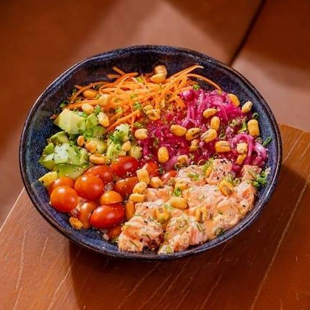Salmão spicy, abacate, cenoura, picles de cebola roxa, tomate cereja, milho crocante.