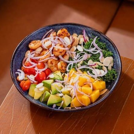 Camarão grelhado, abacate, manga, tomate cereja, couve crispy e lascas de amêndoas.