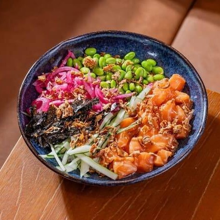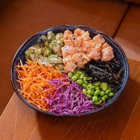 Salmão ao molho de ostras, picles de cebola roxa, pepino em tiras, edamame, cebola crispy, nori.