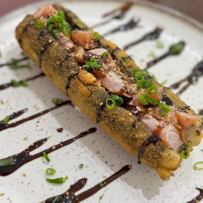 Uma combinação irresistível de texturas e sabores! Camarão crocante com salmão fresco, pepino japonês, arroz, Cream cheese polengui e um toque especial do molho tare. Uma explosão de frescor e crocância em cada garfada!
