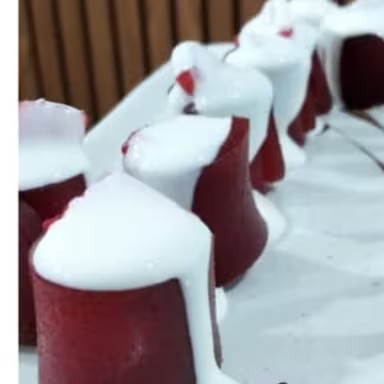 Goiabada enrolada com cream cheese, morango creme de leite e calda de morango.