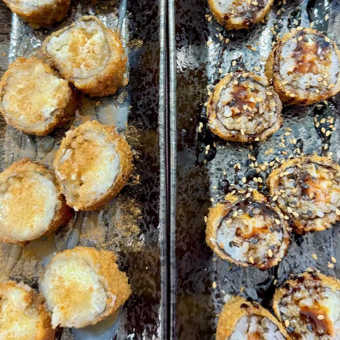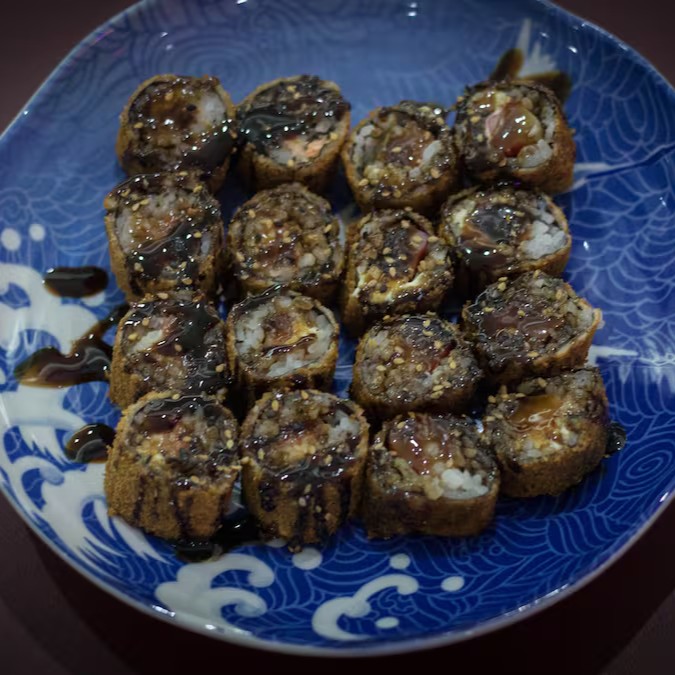 Uma combinação irresistível de texturas e sabores! Camarão crocante com salmão fresco, pepino japonês, arroz, Cream cheese polengui e um toque especial do molho tare. Uma explosão de frescor e crocância em cada garfada!