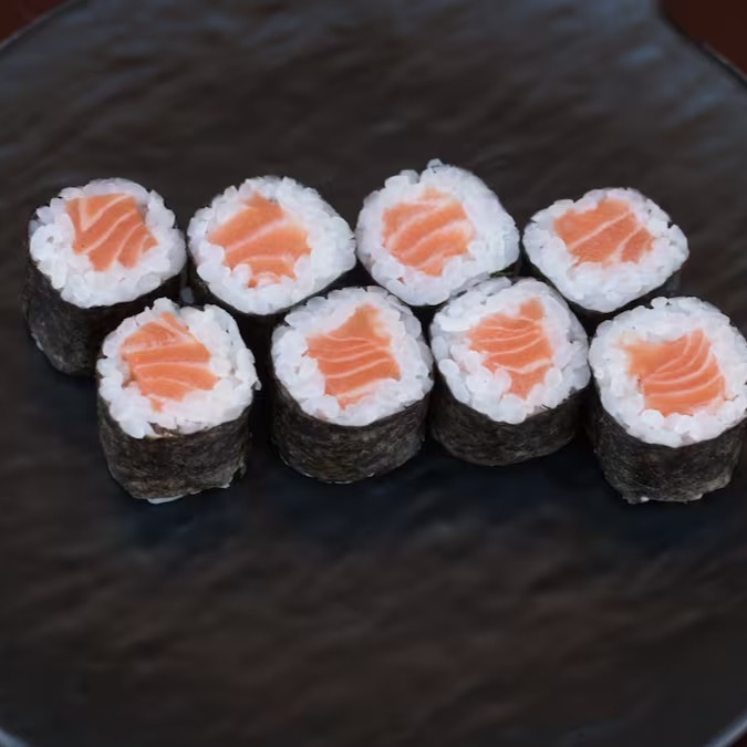8 unidades de uramaki filadelfia e 2 bolinhos de salmão.