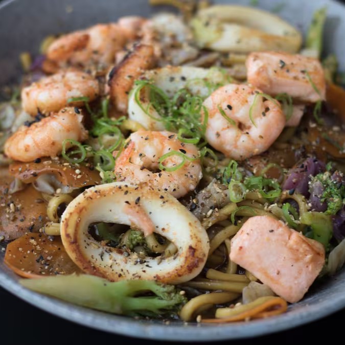 Macarrão, frutos do mar, cenoura, brócolis, repolho e molho especial.