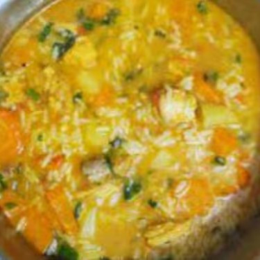 Arroz legumes cubos de frango cheiro verde e caldo.