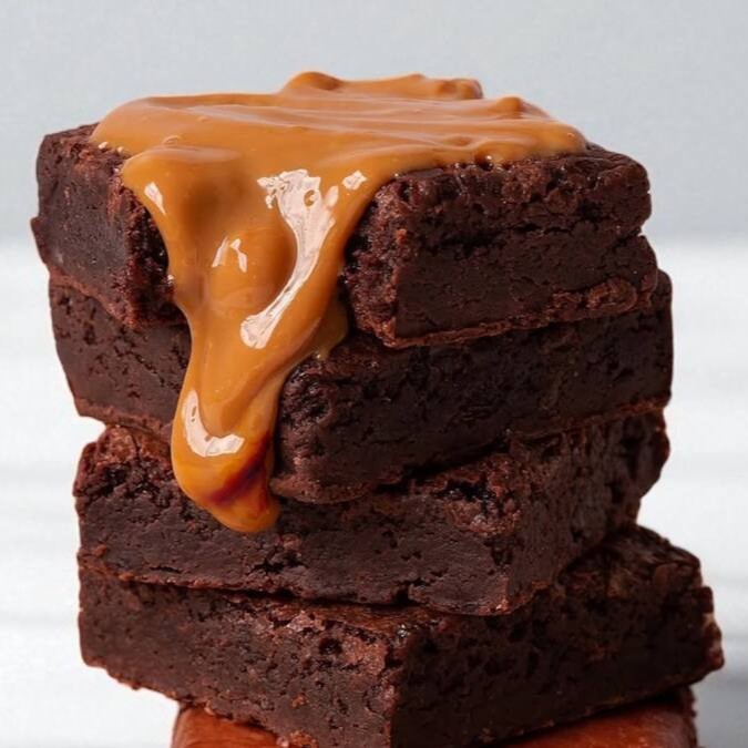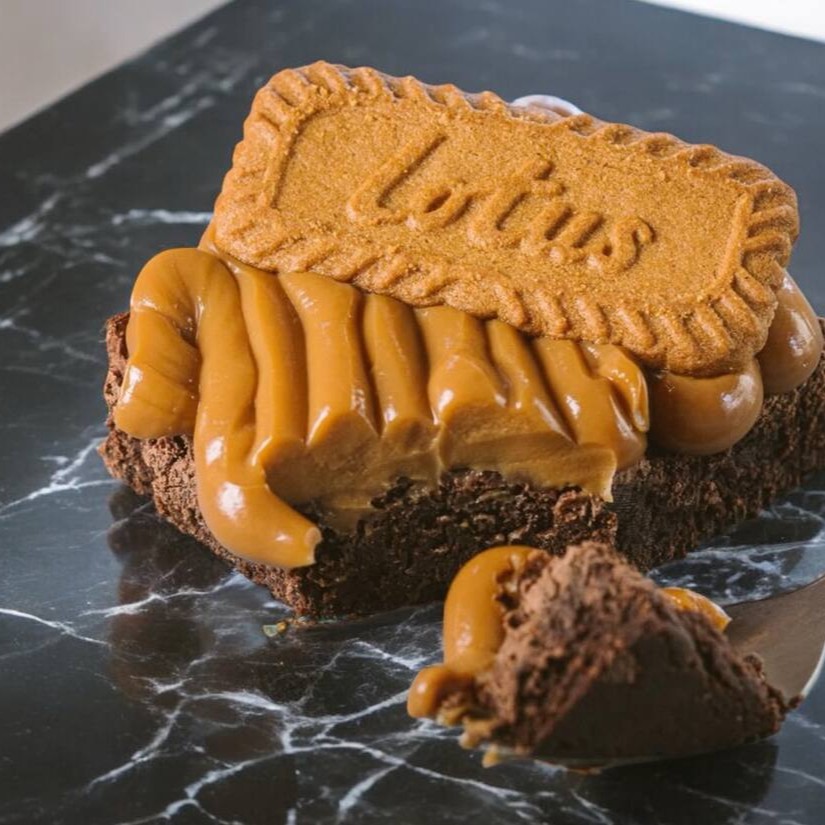 Brownie molhadinho recheado com brigadeiro de doce de leite e Biscoff lótus.