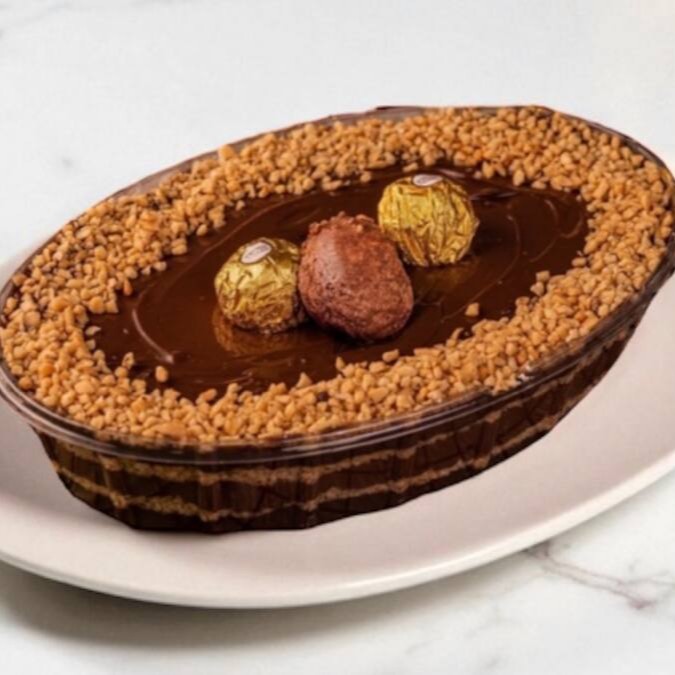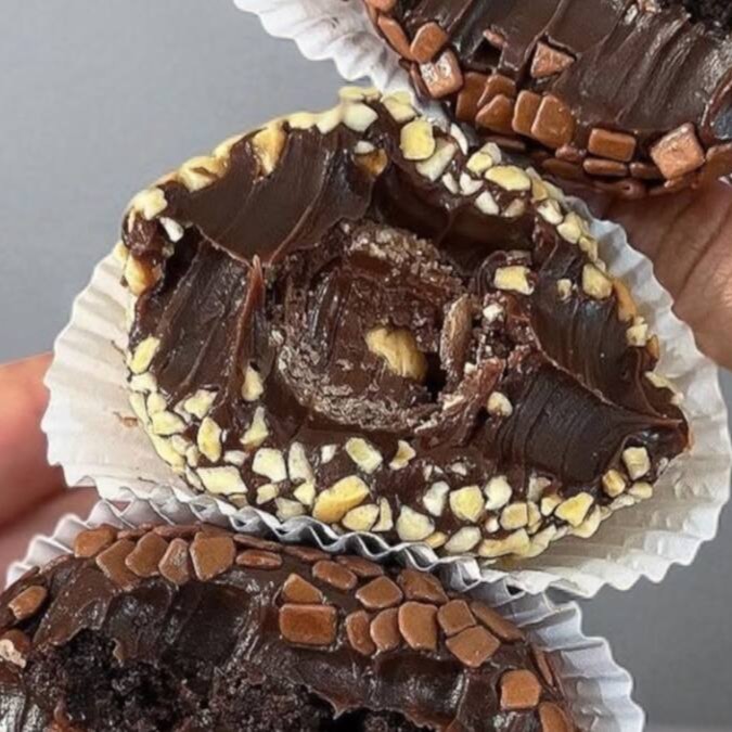 Nosso delicioso brownie molhadinho com recheio de Nutella pura, amendoim e ferreiro Rocher.
