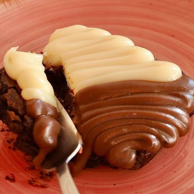 Nosso delicioso brownie molhadinho com recheio de brigadeiro branco e brigadeiro 50% cacau com Kinder ao leite.