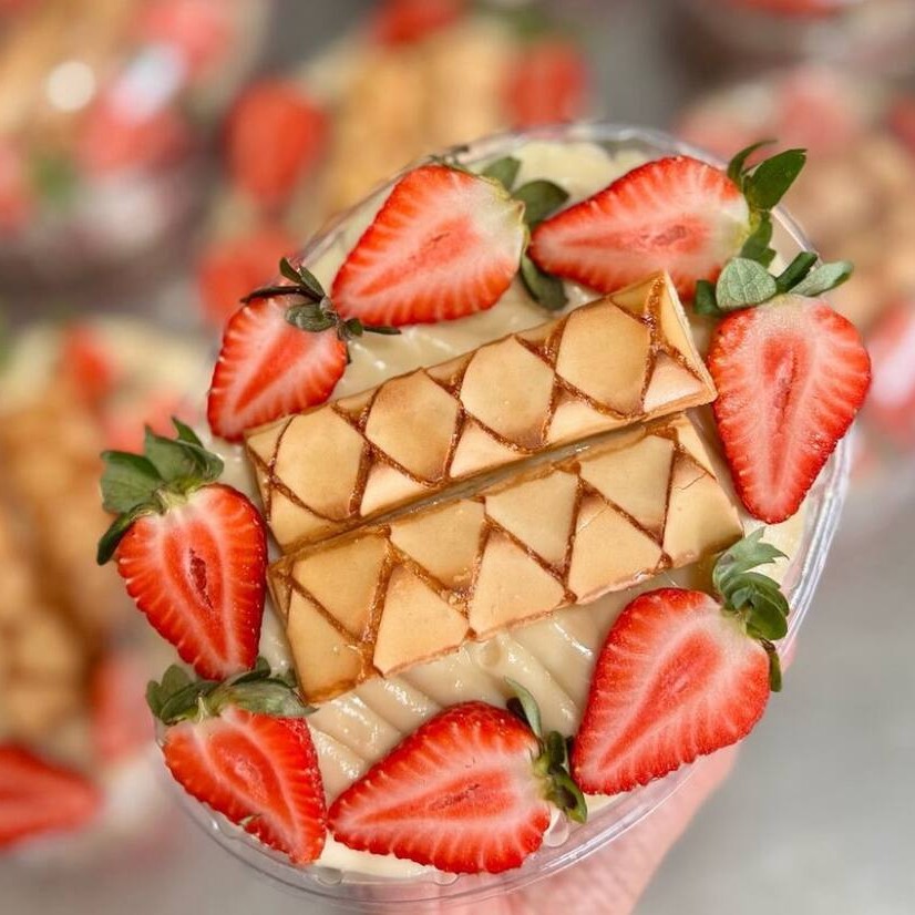 Base crocante, brigadeiro de Ninho, morangos, mousse cremoso de Ninho, finalizado com suspiro.