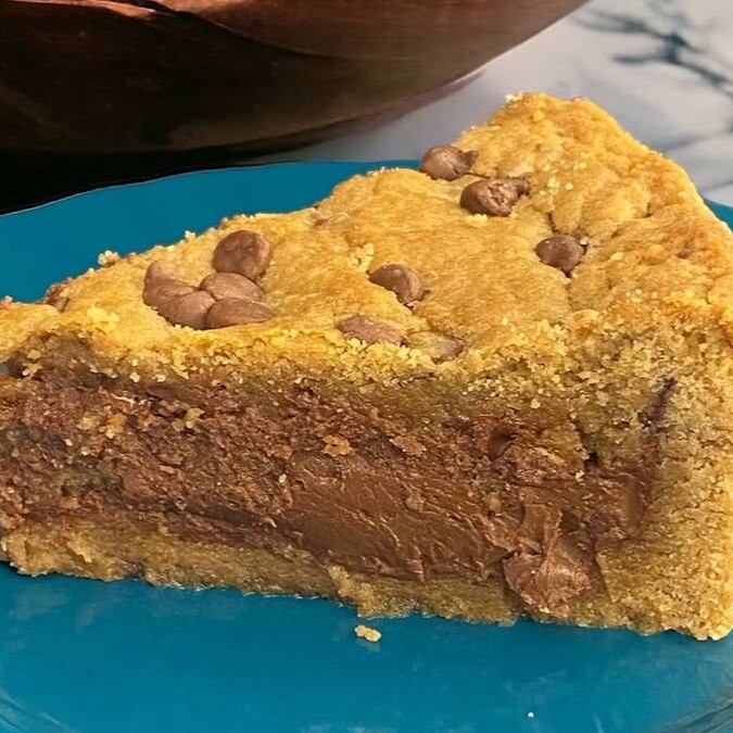 Cookie de chocolate com gotas de chocolate branco e meio amargo, recheada com Nutella. Ela tem 20cm de diâmetro e rende até 8 fatias médias.