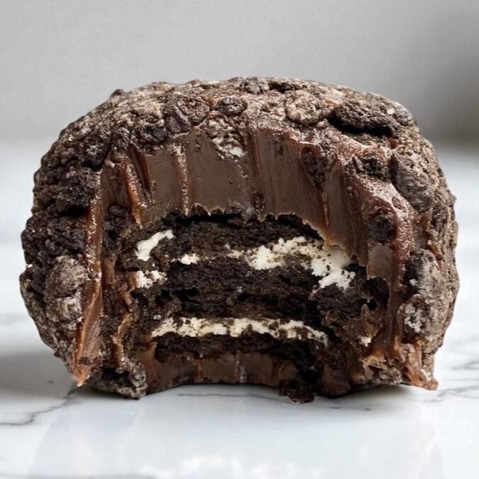 Cookie de chocolate com gotas de chocolate branco, ao leite e meio amargo, recheado com muita Nutella.