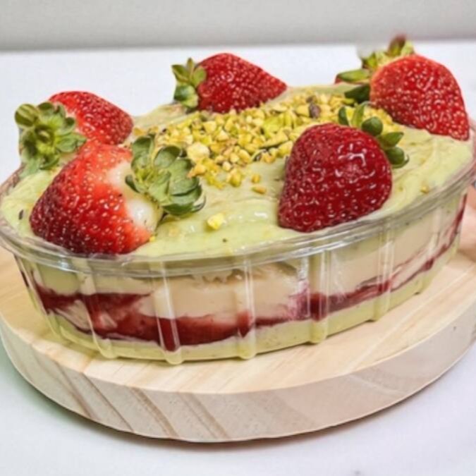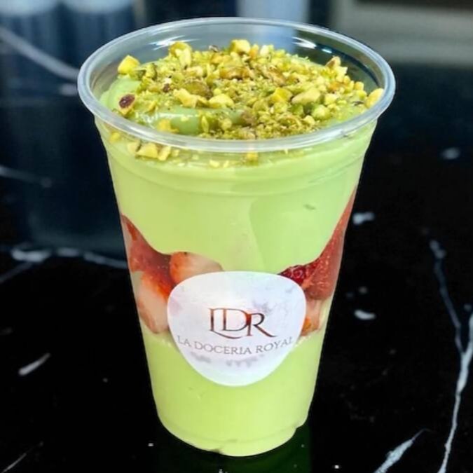 Mousse de Ninho cremoso, bolacha champanhe, brigadeiro de pistache finalizado com pistache triturado.
