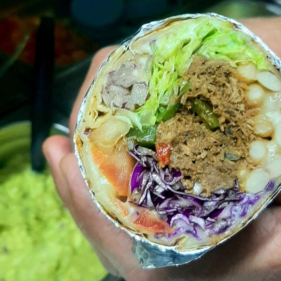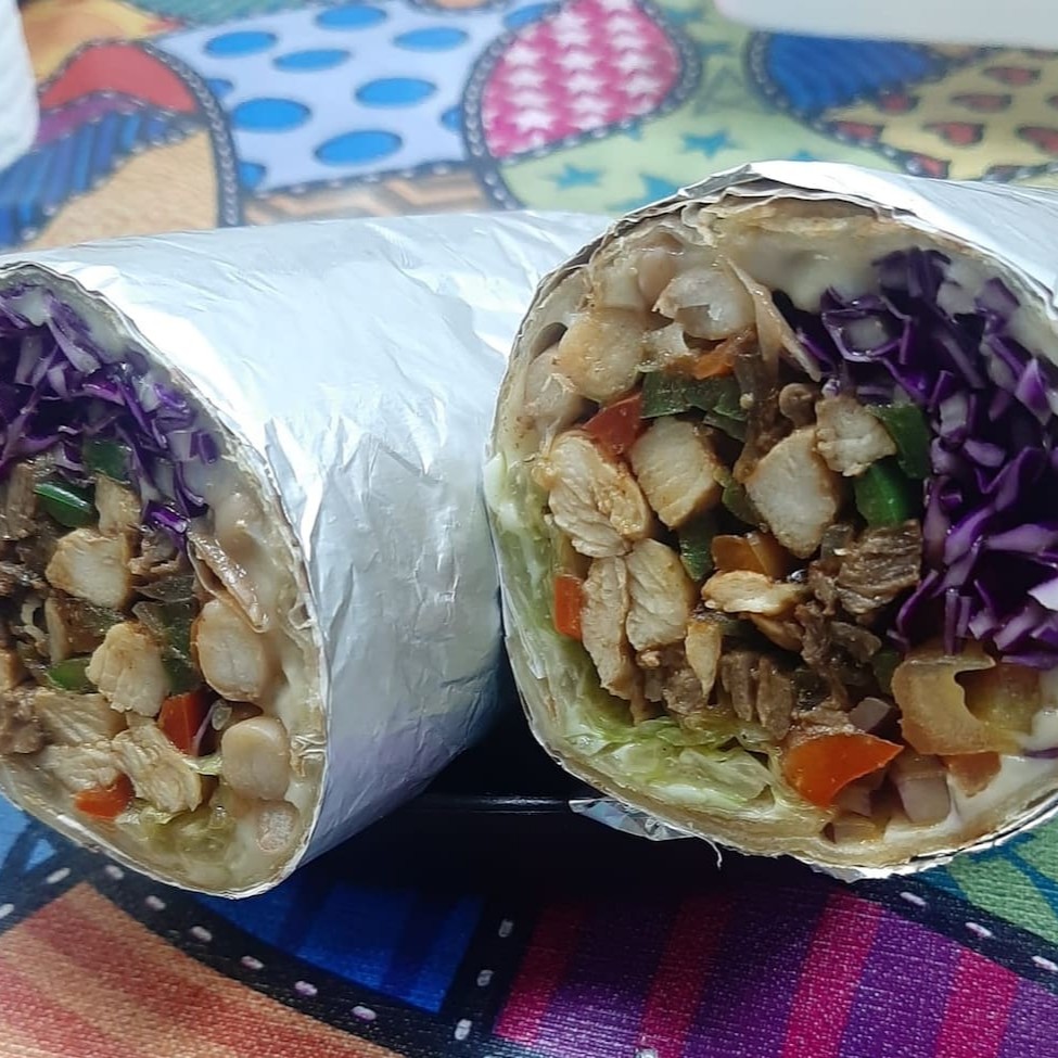 • Tortilha de trigo levemente tostada • Alcatra grelhada com cebola e mix de pimentões • Pimenta • Queijo • Cebola roxa • Frijoles • Alface americana • Repolho roxo • Tomate • Molho especial La Kombinacion • Acompanha 1 molho a escolher + 30g de totopos • Vai cortado ao meio. • Não fazemos alterações/retirada de ingredientes nos nossos pratos!!