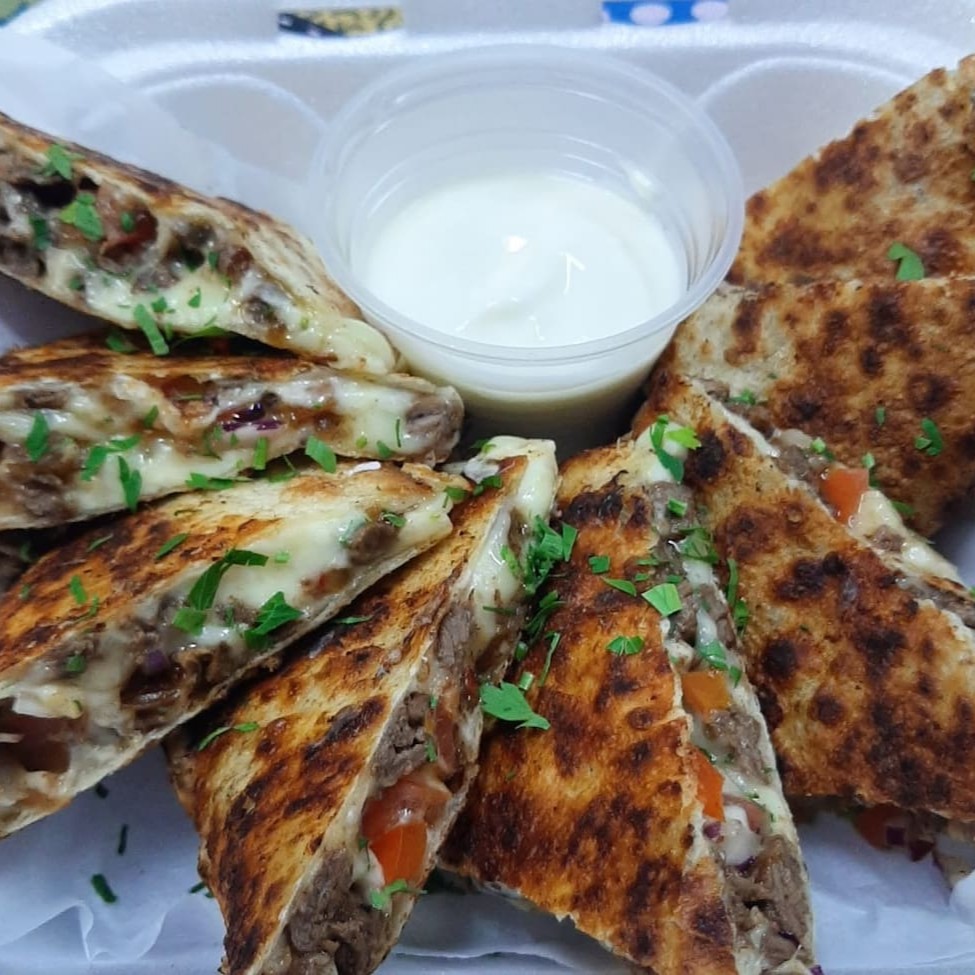 Tortilhas de trigo tostadas e recheadas com muito queijo, Barbacoa (carne bovina cozida e desfiada, marinada com pimenta) salteada com mix de pimentões e cebola, pimenta, tomates e pico de galo. • 8 pedaços • Acompanha 1 molho a escolher • Não fazemos alterações/retirada de ingredientes nos nossos pratos!!