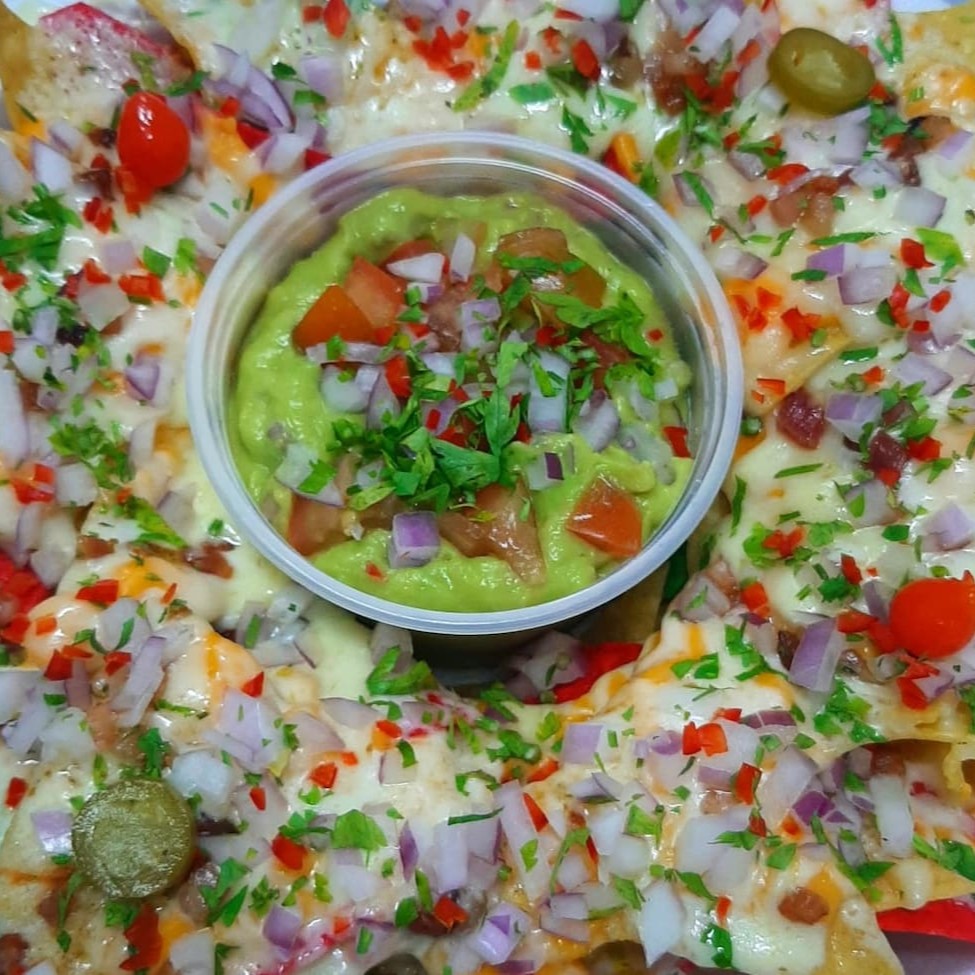 Prato de entrada. Tortilhas de milho crocantes (130g), cobertas com cheddar cremoso, queijo mussarela derretido, bacon crocante, pimentas decorativas, pico de gallo, salsinha e 1 molho principal à sua escolha. 450g * Não fazemos alterações/retirada de ingredientes nos nossos pratos!