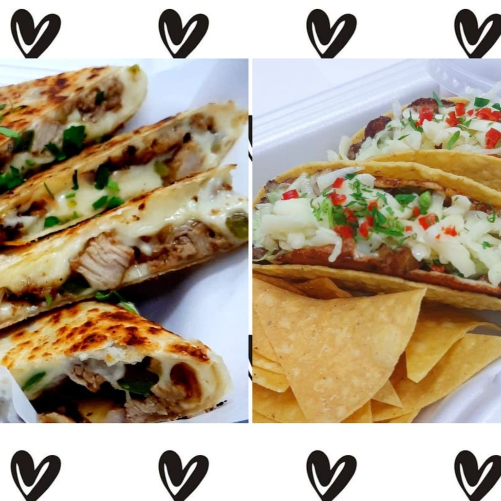 • 1/2 porção de quesadilhas (350g) - escolher sabor • 2 Tacos (350g) do mesmo sabor (a escolher) • Dip de totopos • Cortesia da casa: Salsa Roja, Sour cream e Guacamole • Não fazemos alterações/retirada de ingredientes nos nossos pratos!! Quesadilhas: Tortilha de trigo tostada e recheadas com muito queijo, proteína a sua escolha salteada com cebola e mix de pimentões, molho de pimenta, tomate em cubos e pico de gallo. Tacos: tortilha (milho frita ou trigo tostada), queijo, proteína a sua escolha salteada com cebola e mix de pimentões, repolho roxo, alface americana, molho especial La Kombinacion e pico de gallo. (700g)