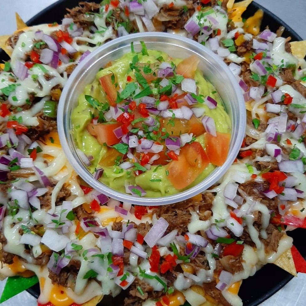 Prato de entrada. Tortilhas de milho crocantes e coloridas com corantes naturais (130g), cobertas com cheddar cremoso, proteína (90g) à sua escolha salteada com cebola e mix de pimentões, queijo mussarela derretido, pimentas decorativas, pico de gallo e Salsinha. Acompanha um molho à sua escolha. 530g * Não fazemos alterações/retirada de ingredientes nos nossos pratos!