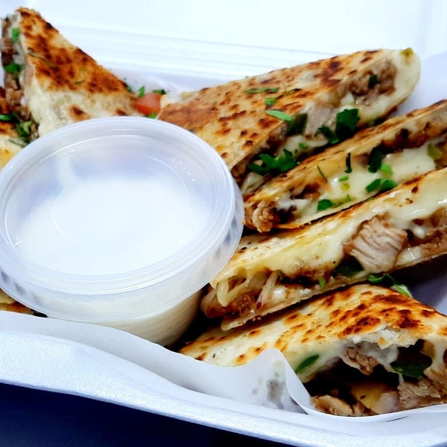 Tortilhas de trigo tostadas e recheadas com muito queijo, proteína a sua escolha grelhada com mix de pimentões e cebola, pimenta, tomates e pico de galo. (340g) • 4 pedaços • Acompanha 1 molho a escolher • Dip de totopos • Não fazemos alterações/retirada de ingredientes nos nossos pratos!!