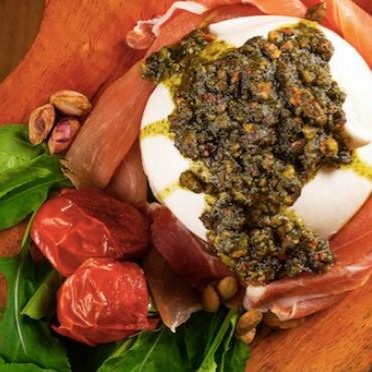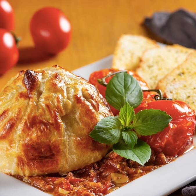 Deliciosa burrata de queijo luxuosamente envolta em uma crocante massa folhada e assada à perfeição. É generosamente coberta com um autêntico pesto de manjericão fresco, amêndoas crocantes, tomatinhos suculentos e uma generosa pitada de parmesão. Acompanhada por tomates assados, que realçam ainda mais a sua riqueza, e fatias de pão italiano tostado, que oferecem um contraste textural irresistível. Este prato é uma verdadeira celebração de sabores e texturas, perfeito para os amantes de queijo e gastronomia italiana.