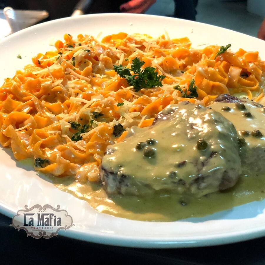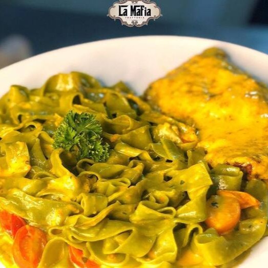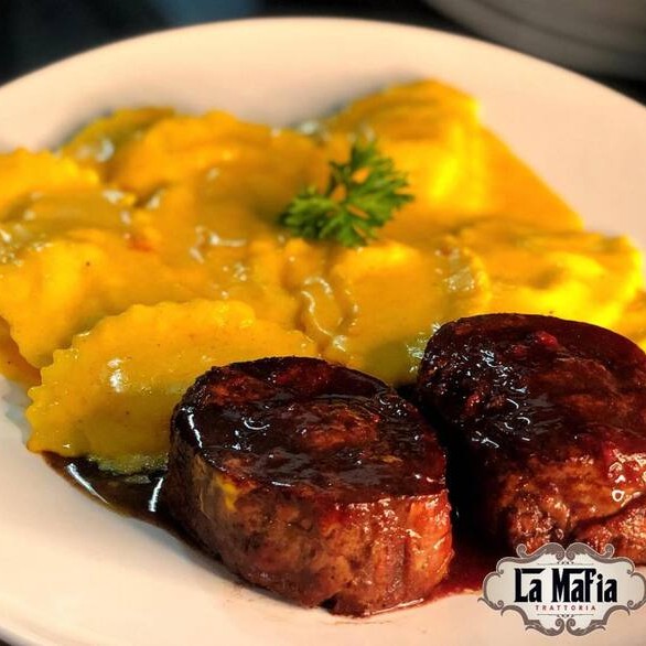 Apresentamos nosso 'Filetto al pepe verde', uma das preciosidades culinárias em 'Sugestões do Chefe'. Uma requintada seleção de mignon suculento, regado com um irresistível molho cremoso de pimenta verde que explora sabores intensos. O prato é magnificamente complementado por um tagliatelle, meticulosamente preparado na manteiga de sálvia. Esta harmoniosa combinação promete uma explosão de sabores que irá seduzir o seu paladar. Uma verdadeira obra de arte gastronômica à sua disposição.